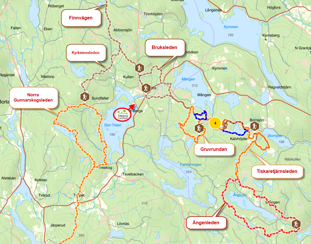 Nedan listade leder ligger inom närområdet och kan enkelt nås via bil eller direkt med start från Treens Camping.